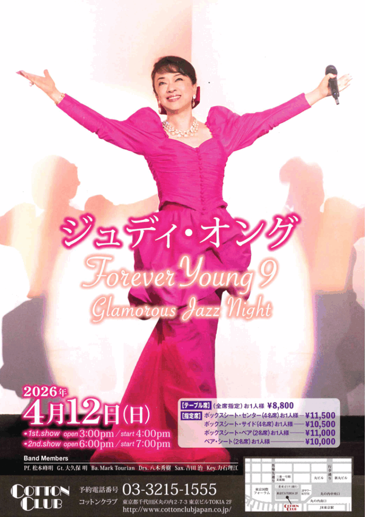 ◆コットンクラブコンサート2026◆「Glamorous Jazz Night 〜Forever Young IX〜」4/12(日)決定しました!9 views <コットンクラブのURL >https://www.cottonclubjapan.co.jp/jp/sp/artists/judy-ongg-260412/お問い合わせ:株式会社ヒーモリ info@judyongg.com heemory_subRECENT POSTED2025年12月15日◆テレビ出演情報◆テレビ朝日「今夜決定!全国1万人が選んだ100年先も残したい昭和の名曲」出演!!未分類2025年12月8日◆テレビ出演情報◆BS朝日【再放送】未分類2025年11月20日◆「第62回ゴールデン・ホース・アワード」(金馬奨)に登壇!◆未分類2025年11月7日◆フジテレビ「ぽかぽか」生放送出演します!◆未分類2025年11月5日◆「徳光和夫 人生の名曲に喝采を!コンサート 2026」に出演決定!◆未分類heemory_subの記事一覧